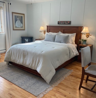 Wrapped in high-quality linens, the queen bed is as inviting as it looks — perfect for a blissful night’s sleep, a lazy afternoon nap, or catching up on Netflix on the new smart TV. Catch up on your reading with your feet up in the cozy feather chair and ottoman, or settle at the small writing desk with a journal and a warm drink.